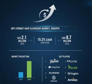 NEWARK, DE, UNITED STATES, February 4, 2026 /EINPresswire.com/ -- The global dry-format hair cleansers market is poised for significant expansion, with a projected value of USD 2.1 billion in 2026 escalating to USD 8.7 billion by 2036, representing a compound annual growth rate (CAGR) of 15.2%, according to the latest analysis by Future Market Insights (FMI). This rapid growth is underpinned by a marked industry-wide shift from traditional wash-centric hair care to convenience-driven, maintenance-focused solutions that prioritize scalp comfort, oil control, and styling integrity without reliance on water.